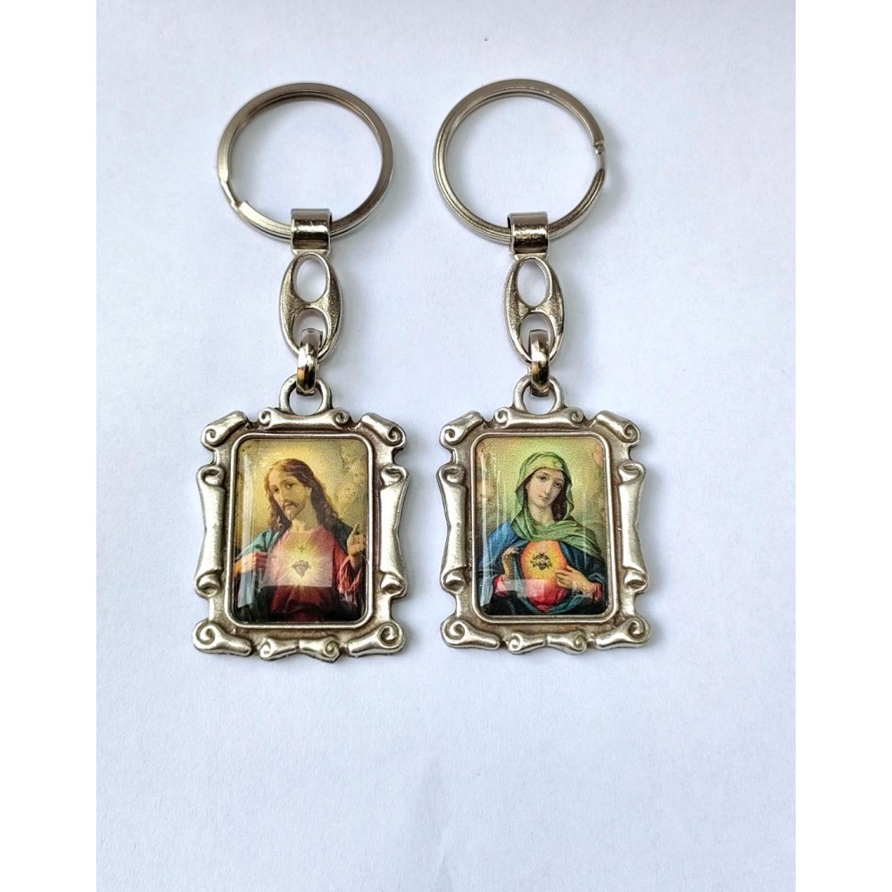Breloc din metal reprezentand Preasfanta Inima a lui Isus si Inima Neprihanita a Mariei.