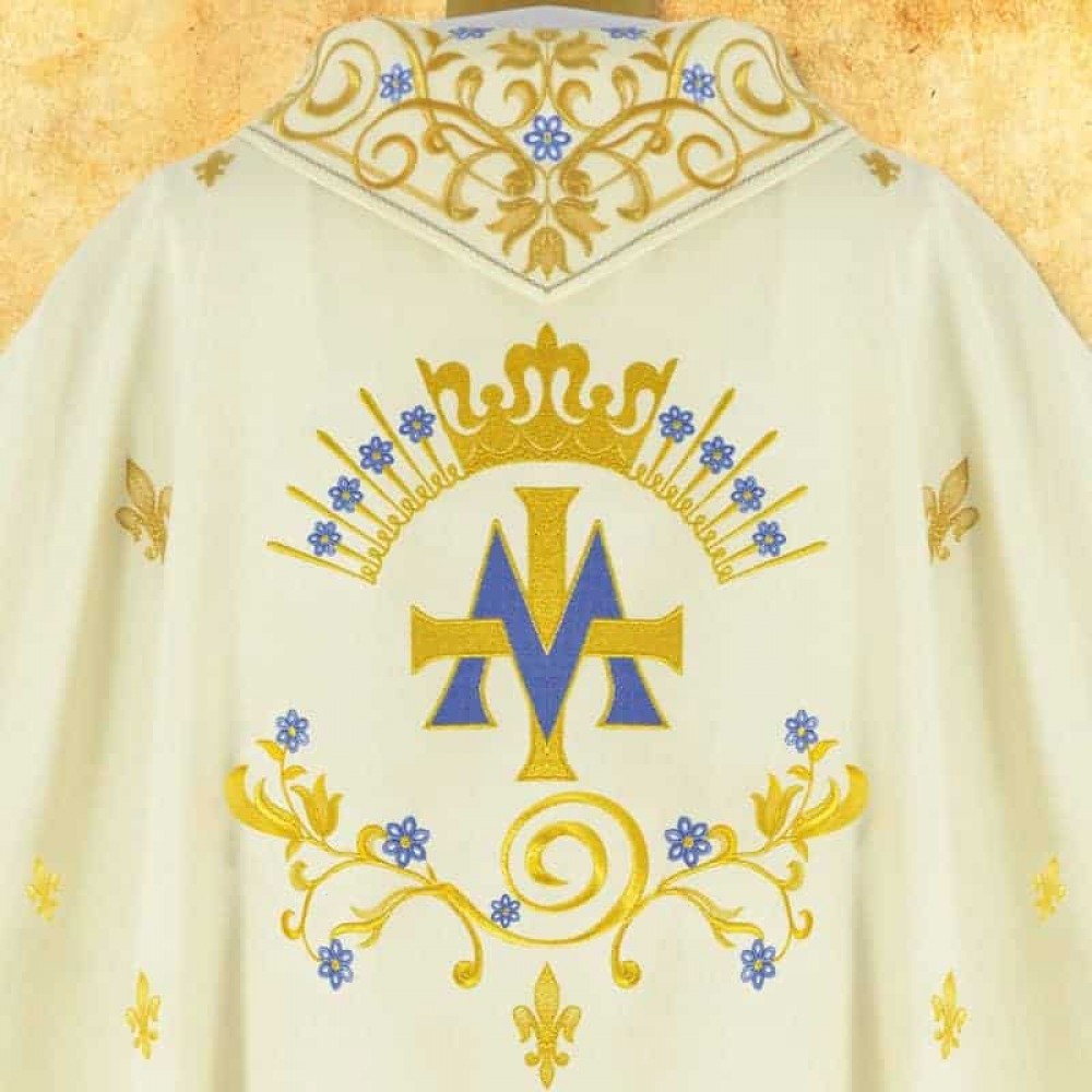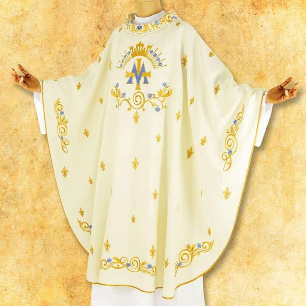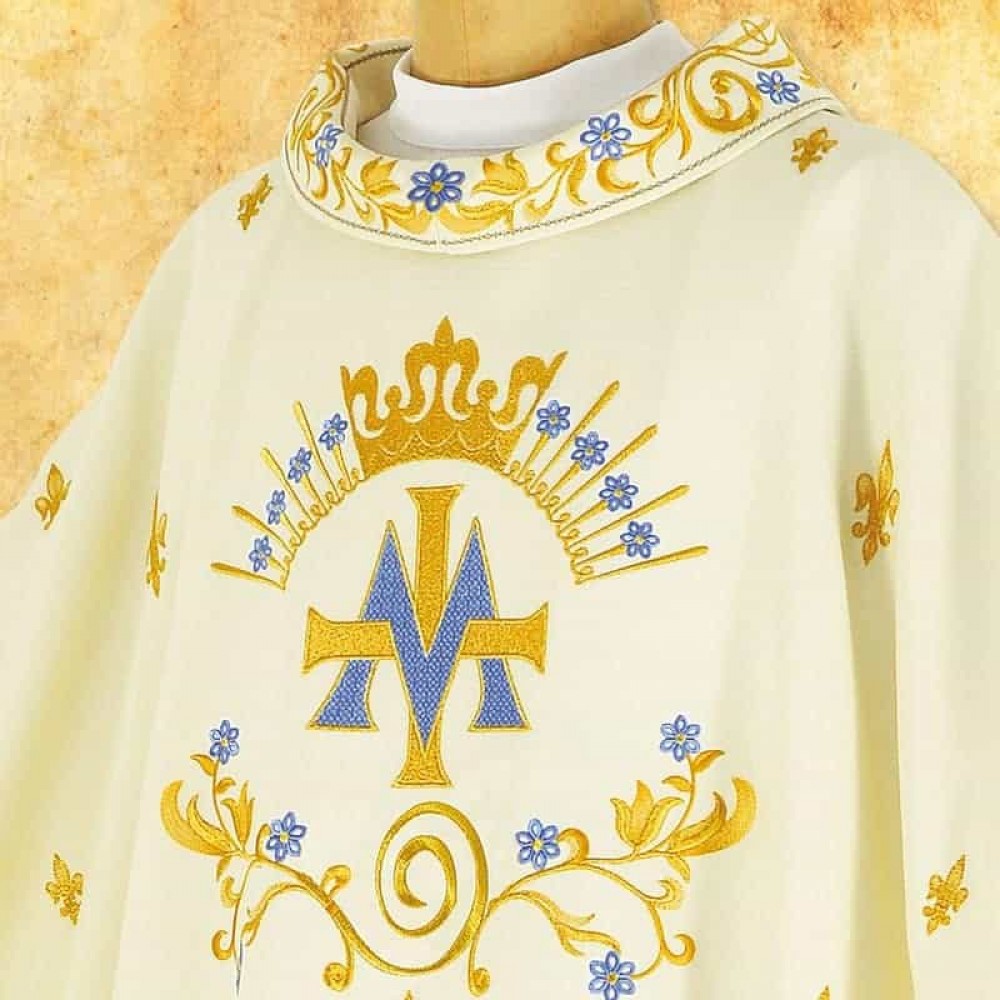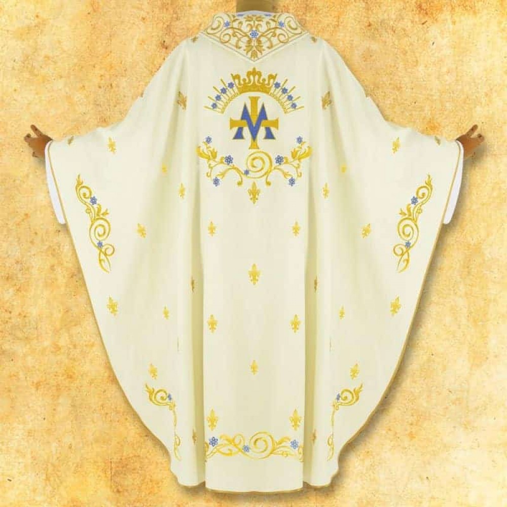 Chasuble realizate din tesatura de inalta calitate "Sacroline" în culoarea ecru, intercalate foarte subtil, ușor cu fir de aur. Materialul la atingere este extrem de moale, delicat și foarte bine aranjat. Un amestec de fibre naturale: 80% (vâscoză, in, mătase) și sintetic: 20% (poliester).