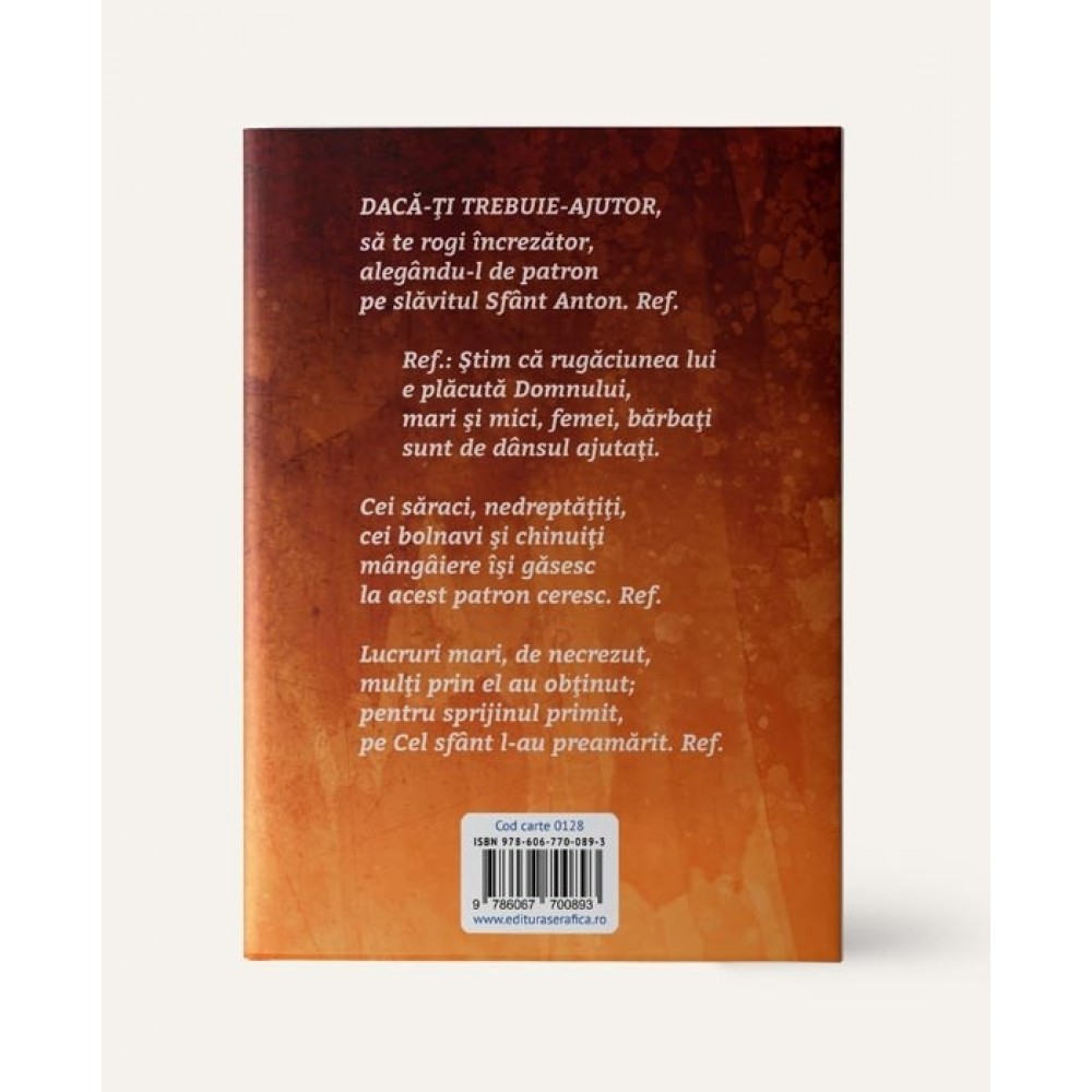 Sfântul Anton continuă să fie şi astăzi ceea ce a fost în viaţa pământească: o lumină şi o călăuză pentru poporul creştin. Şi astăzi emană din el un mesaj de mântuire: mesajul harului divin, care trebuie să fie dobândit, păstrat şi dezvoltat. Din cuprins: Treisprezece zile de rugăciune meditată către Sf. Anton de Padova. Rugăciuni comune. Rugăciuni personale. Invocaţie la Sf. Anton. Pentru o viaţă creştină sfântă. Pentru binefăcători. Rugăciunea mamei sau a tatălui. Pentru copii. Rugăciunea pelerinilor în faţa mormântului Sfântului. Imnul Sf. Anton de Padova. Rugăciunea Sf. Anton către Isus Cristos. Maica Domnului. Cântece în cinstea Sf. Anton.