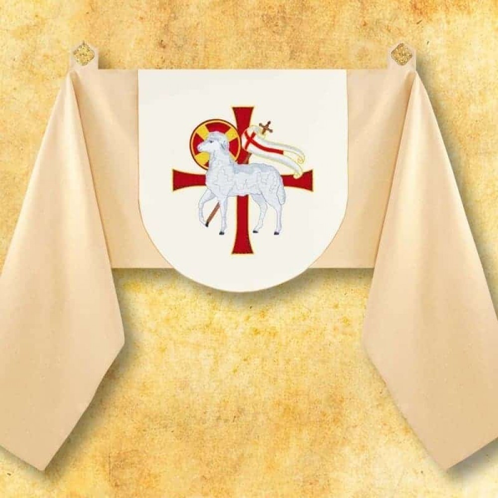 Val de umăr - ținută liturgică realizată din țesătură Golden Mist, decorată cu broderii bogate. Fixat cu cârlige elegante cu lanț, are și buzunare pentru mâini